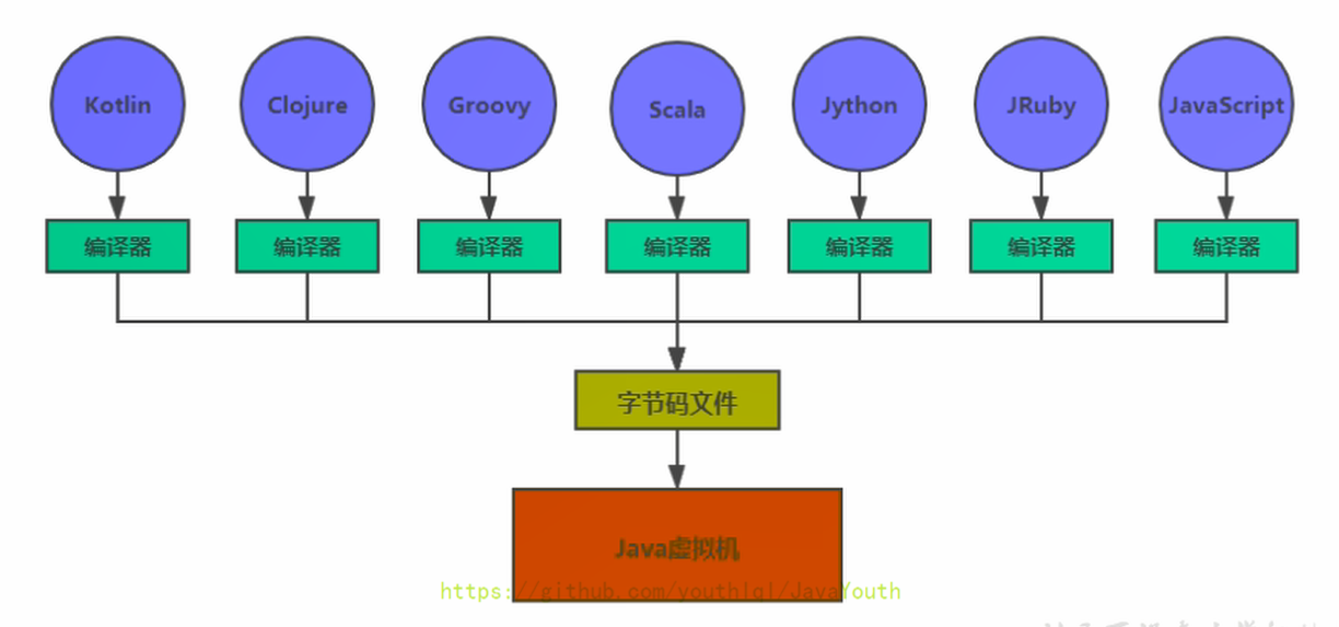 - 随着Java7的正式发布,Java虚拟机的设计者们通过JSR-292规范基本实现在Java虚拟机平台上运行非Java语言编写的程序。