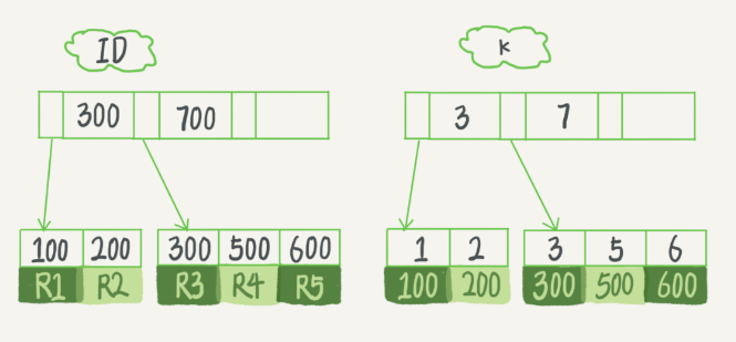 - 在k索引树上找到k=3的记录,取得 ID = 300;