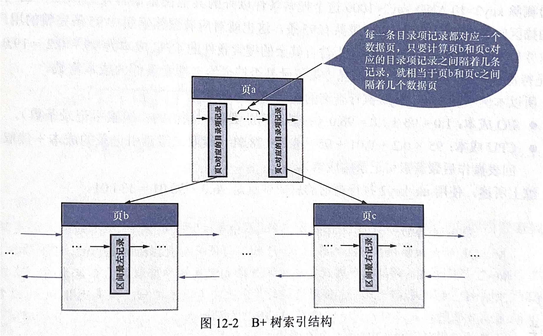否则只沿着区间最左记录向右读10个页面,计算每个页面平均包含多少记录,然后用这个平均值乘以区间最左记录和区间最右记录之间的页面数量就可以了。那么问题又来了:怎么估计区间最左记录和区间最右记录之间有多少个页面呢?要解决这个问题,还得回到B +树索引的结构中来,如图12-2所示。