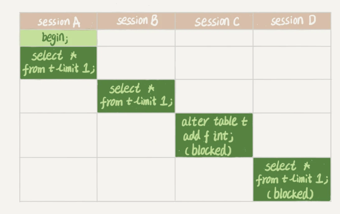 - 读写锁之间、写锁之间是互斥的,用来保证变更表结构操作的安全性。因此,如果有两个线程要同时给一个表加字段,其中一个要等另一个执行完才能开始执行。